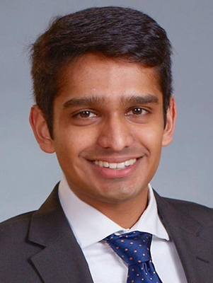 Jigar Bhakta in a dark suit, white shirt, and dark blue tie