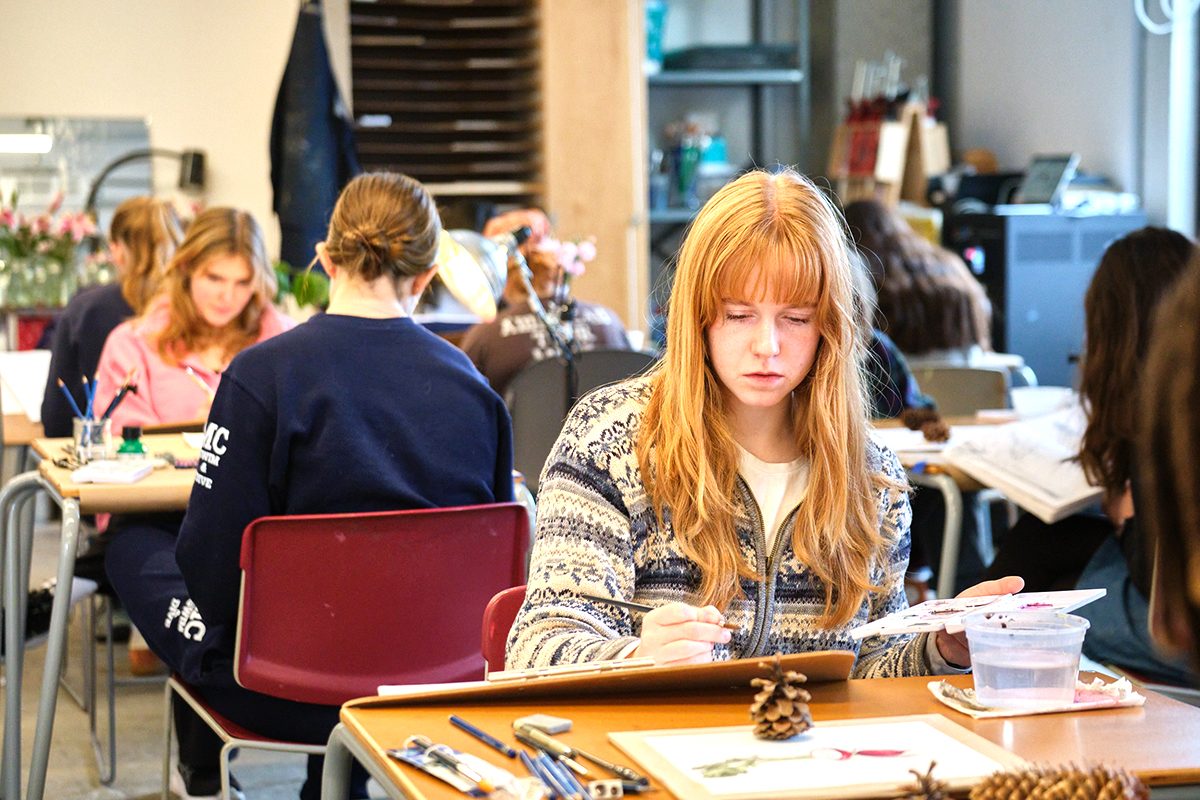 What does it mean to truly see the natural world and create a faithful transformation of 3D natural forms to 2D? Biology professor Kirsten Coe, a plant ecophysiologist, and Vermont artist Kate Gridley teamed up over winter term to offer a course on artistic techniques for capturing plant forms using a variety of artistic methods, including graphite, charcoal, silver point, ink, and watercolor. In the field, at the microscope, and back in the studio, students explored a diversity of living plant specimens representing the broad scale of botanical diversity—from the shapes of trees to the cells of mosses. Their challenge was to develop scientifically accurate, publication-quality illustrations in a feedback-rich studio environment.