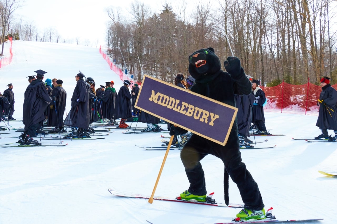 The 2016 February Celebration continued at the Middlebury College Snow Bowl where members of the class participated in the traditional “ski down” in their academic regalia. On snowboards, skis, snowshoes and foot, the graduates descended the Lang trail, crossing over to Cameron, which took them to the cheering crowd below in one of Middlebury’s most-cherished traditions.