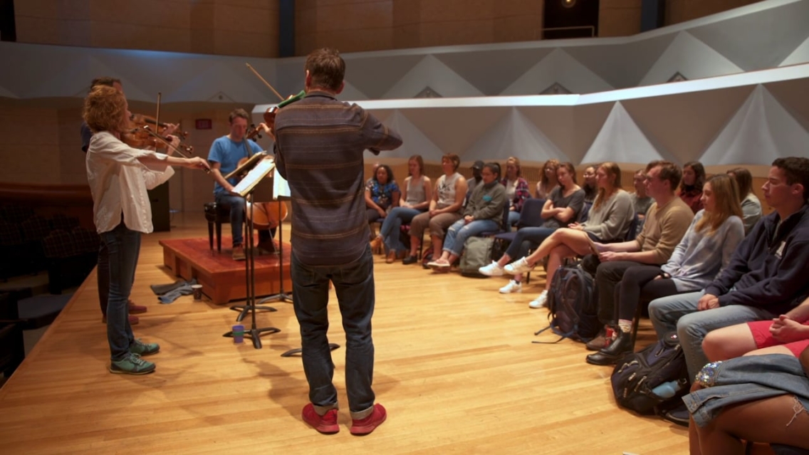 For 75 minutes, the string players, who were in residence on campus for a week, filled the hall with music as the students listened and then discussed the interplay of art, acoustics, emotion, and perception.