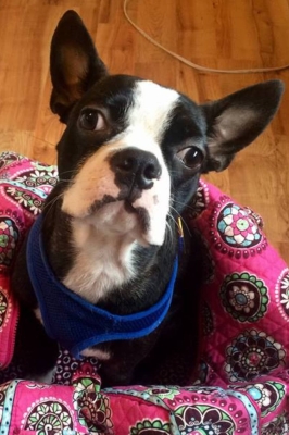 Louie, our little Boston terrier with a big personality! Louie’s a people-loving pup who’ll charm you with his goofy antics and warm cuddles. He’s available for pets and more than happy to lounge by your side.