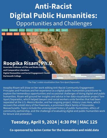 Roopika Risam will draw on her work editing Anti-Racist Community Engagement: Principles and Practices and her experience as a digital public humanities practitioner to explore the tremendous opportunities and occasional challenges of doing digital and public humanities. Risam will ground her insights and advice in her data visualization project Torn Apart/Separados, which helped lawyers and social workers unite families that had been separated at the U.S.-Mexico Border, and her ongoing project, History Lives Here, which recovers the untold story of the Freemans, a prominent Black family of Gloucester, Massachusetts. Topics include the unrecognized history of public humanities, ethics of community partnership, and the challenge of evaluating digital and public humanities work for tenure and promotion.