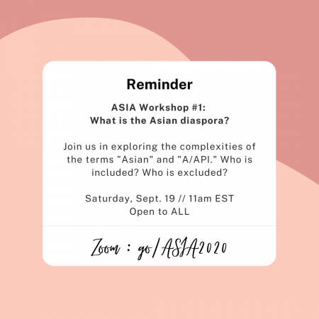 Join ASIA in exploring the complexities of the terms “Asian” and “A/API.” Who is included? Who is excluded? This is the first workshop in a three part workshop series hosted by ASIA this fall. These workshops are open to ALL and no prior knowledge is necessary to attend! See you there!! :)