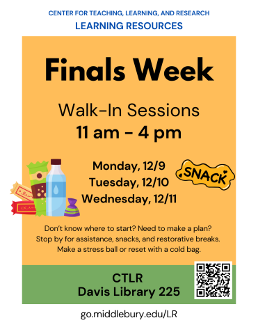 CTLR Learning Resources’ Finals Week Drop-In Sessions on May 13-15 from 1-4 pm—we can talk you through a finals week schedule that preserves sleep and down-time while you get things done!