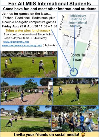If you joined us for the first game day, 8/23, come back the second Friday with new international friends met during Welcome Week. Bring water & lunch, plus any questions about being in Monterey.