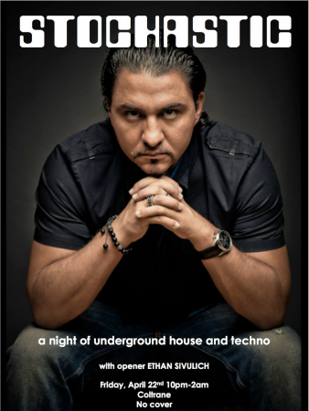 On Friday, April 22nd, New York-based underground DJ Stochastic will be at Middlebury, spinning the deepest, darkest underground house and techno. With a long resume of club appearances including the world renowned Cielo, and radio appearances in Ibiza, this is one you won’t want to miss. We’ve got a sound system that will blow the roof off and a light show that has to be seen to be believed. There’s no place else you’d rather be on a Friday night! Ethan Sivulich will open.”