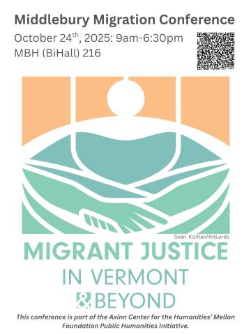“Migrant Justice in Vermont and Beyond” is a one-day conference taking place on Friday October 24, 2025 from 9am-6:30pm at McCardell Bicentennial Hall 216. Lunch and coffee break will be provided for all attendees. All Middlebury affiliates and Mellon-grant Community Partners are welcome, though seating is limited. This conference is part of the Axinn Center for the Humanities’ Mellon Foundation Public Humanities Initiative.