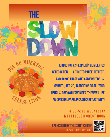 Take a moment to slow down and get creative. The Scott Center’s weekly slow down event will have the option to make your very own papel picado, the colorful paper banners that add life and movement to the altars and celebrations for Dia de Muertos.