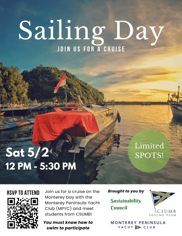 Join us for a cruise on the Monterey bay with the Monterey Peninsula Yacht Club and the CSUMB Sailing Team. Students must know how to swim to participate. Reserve your spot by filling out this form (limited spots): https://forms.gle/FvzcVgWLhY2MNqeN6. Further details will be sent to registered participants.