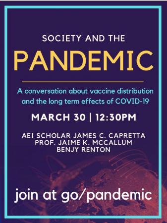 Join the AEI Club at Middlebury on March 30th at 12:30pm for a fascinating discussion, “Society and the Pandemic”: A conversation about vaccine distribution and the long term effects of COVID-19. The discussion will take place over zoom with AEI Scholar James C. Capretta, Middlebury Sociology Professor Jaime K. McCallum, and Middlebury student Benjy Renton.
