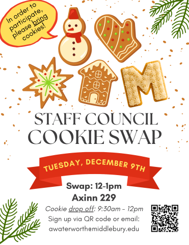 Join your colleagues for a holiday cookie swap! You can drop off cookies between 9:30am-12pm in Axinn 229 and Staff Council will arrange them on plates we’ll provide. Swapping will happen from 12-1pm. Please bring your own container!