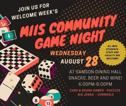 This event is open to all MIIS students, staff and faculty! Stop by Samson for beverages, snacks and to play some games before the semester begins.