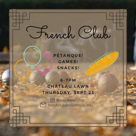 Join French Club for snacks and games on Chateau Lawn! We’ll be getting to know each other as we kick off Fall events