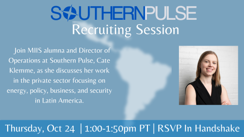 Join MIIS alumna and Director of Operations at Southern Pulse, Cate Klemme, as she discusses her work in the private sector focusing on energy, policy, business, and security in Latin America.