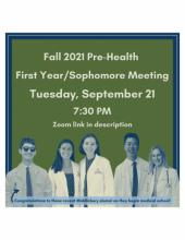 All students considering a career in the health professions are encouraged to attend the Pre-Health FY/SO Info Session on Tuesday, 9/21/2021 from 7:30-8:30 PM with Hannah Benz, Mary Lothrop and members of the Pre-Health Society, UR-STEM, and Women in Health Sciences.