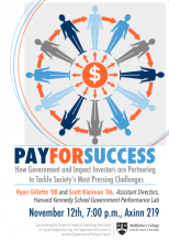 Pay for Success-How Govt. and Impact Investors are Tackling Society’s Challenges Please join us on Thursday, November 12 at 7:00 p.m. In Axinn 219 to learn about new a public policy innovation that is helping accelerate progress on society’s most challenging social problems. Pay for Success contracts (also called Social Impact Bonds) combine social impact investing, rigorous evaluation and data analysis, and government performance contracts to improve the delivery and impact of social service programs.