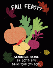 Weybridge Fall Feast! Free local food! Saturday October 25th 4:30pm, BYO plate/bowl, 28 Weybridge St (weybridge local foods house) Huge Party! Huge Picnic! Bring all your friends! Live music! Outside!