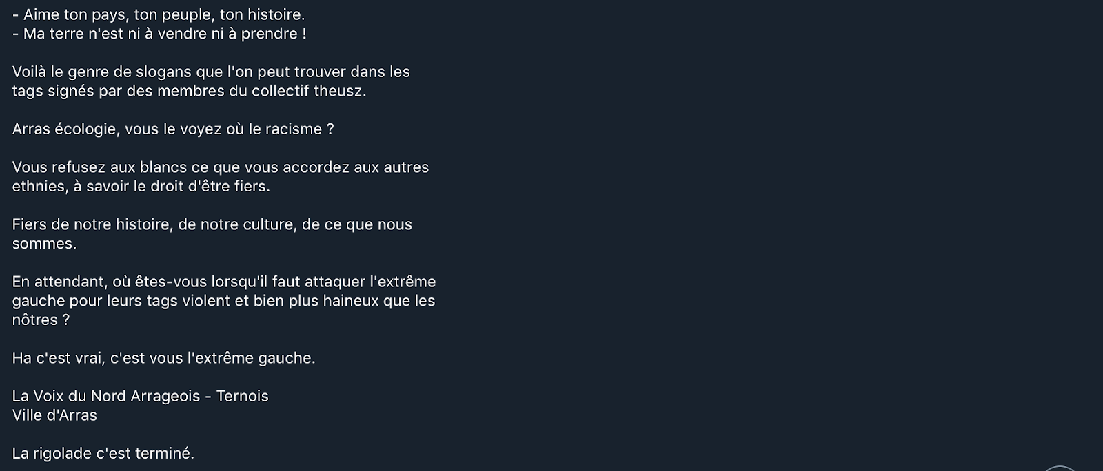 The first slogan that the author quotes is masked as a simple statement of French pride. However, as one continues to read, the author addresses Arras Ecology, the Arras branch of a left-leaning French political party, essentially asking why other ethnicities can be proud of their culture but whites are denied the same right. This thread can be tracked through other posts in the group and white supremacist and xenophobic groups worldwide.