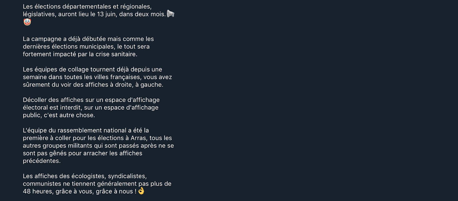 Figure 7 was published to the group’s feed on April 1, 2021. It primarily discusses strategies for pushing far-right candidates in the June 13 regional elections. The author spends a significant amount of time discussing strategies for postering for the National Rally and removing the posters for competing political parties and groups, like the environmentalists, trade unions, and communists. The author discusses specifically how anyone can remove posters from walls and public areas that are not electoral displays and suggests that through personal and group action, the posters put up by rival political groups do not last for more than 48 hours.