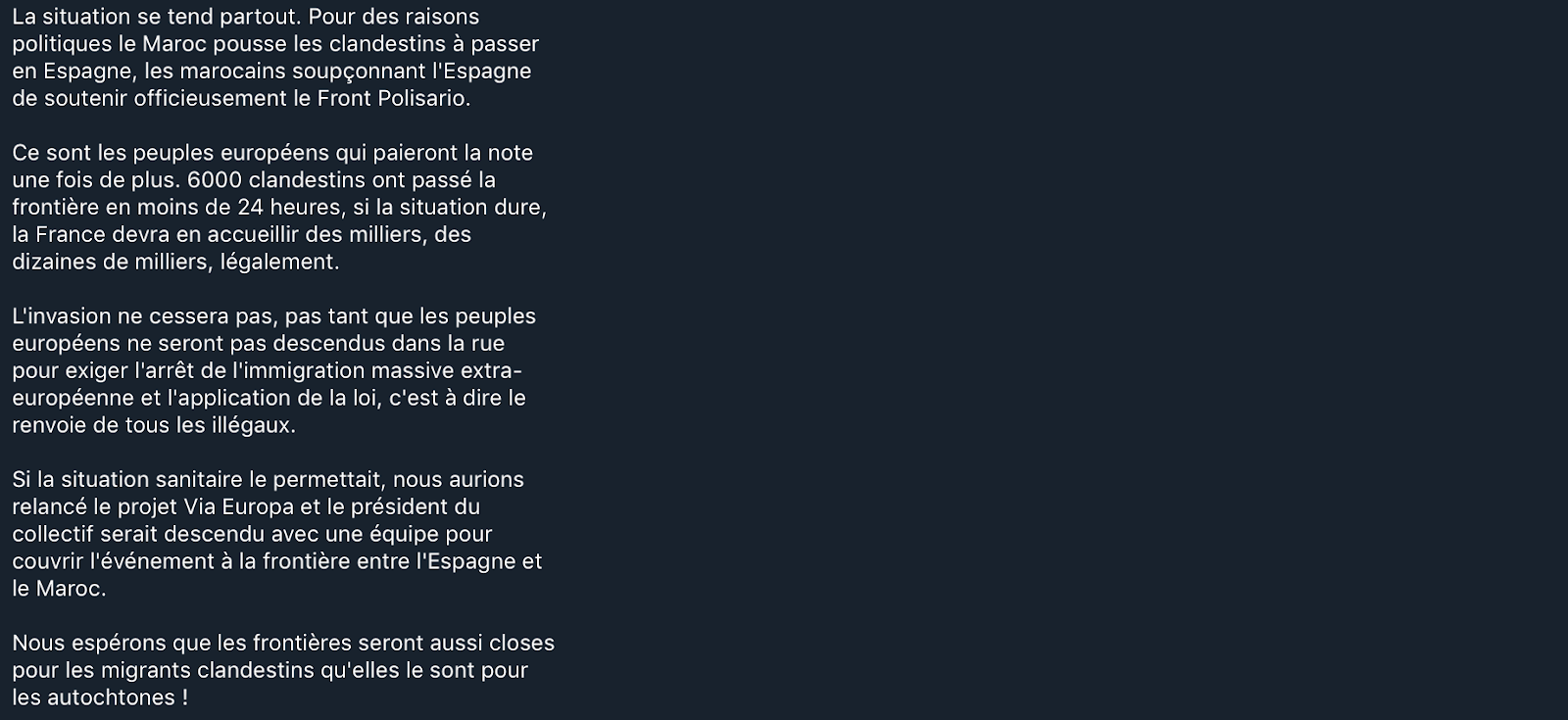 Earlier in the post, however, the author’s anti-migration bias is more clearly outlined. They focus on the issue of legal migration to France, writing that tens of thousands of migrants have been legally welcomed to France. Often undocumented migration will take center stage in xenophobic discussions of migration, likely as a strategy to mask anti-migrant biases, but this post pushes explicitly against legal migration. They construct a view of migration that portrays foreigners as a burden to France, saying, “It is the peoples of Europe who will foot the bill once again.” In this way, the author is simultaneously pushing against migrants and the French government. They call for the peoples of Europe to descend into the streets and protest against the “massive extra-European immigration” they see plaguing the continent. It is worth noting that this language is not explicitly anti-intra-European immigration. This leaves the reader with the sense that perhaps the author is not inherently opposed to Europeans migrating between European countries; in this way, the author’s bias towards immigrants of color comes more sharply into focus. In addition, using the term “peoples of Europe” instead of “Europeans” casts their opposition to immigration in explicitly ethnic terms.