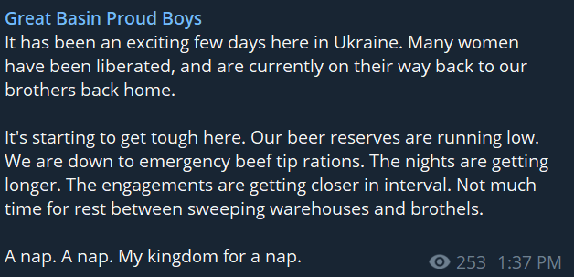 After months of rising tensions and Russian military buildup along the Ukrainian-Russian border, US intelligence claims of an imminent Russian invasion of Ukraine were borne out. With images pouring in of bombed out apartment buildings, the arming of everyday Ukrainian civilians, subways-turned-bomb shelters filled to the brim, the world has its eyes set firmly on Ukraine. Since 2014, the fighting between the two brother nations has drawn the attention of far-right, neo-nazi groups and individuals. The opportunity to network offline, partake in real military fighting, and gain authentic tactical training to bring back home was too good of an opportunity for these extremists to pass up. Now, as the fighting escalates to a critical, all-out-war level, people have been wondering if this will bring about a new flood of foreign fighters. Almost immediately after news spread across the globe that Russia had, in fact, invaded Ukraine, Proud Boys’ telegram channels began posting about traveling to Ukraine to fight alongside Russian soldiers.