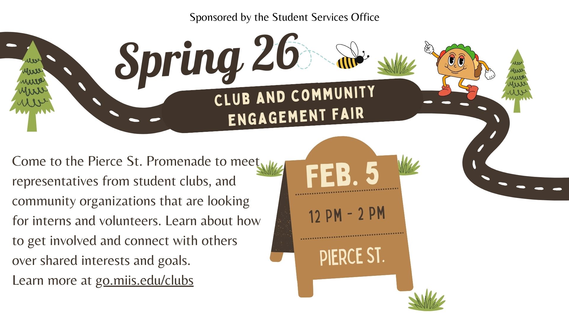 Come to the Pierce Street Promenade to meet representatives from student clubs, and community organizations that are looking for interns and volunteers. Learn about how to get involved and connect with others over shared interests and goals. Learn more at go.miis.edu/clubs