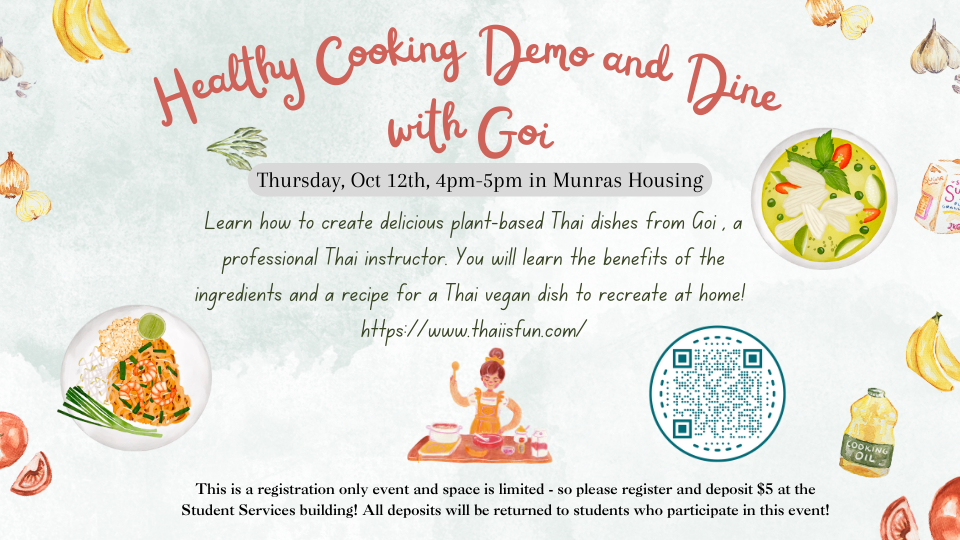 Come to Munras Housing and learn how to create delicious plant-based Thai dishes from Goi , a professional Thai instructor. You will learn the benefits of the ingredients and a recipe for a Thai vegan dish to recreate at home!