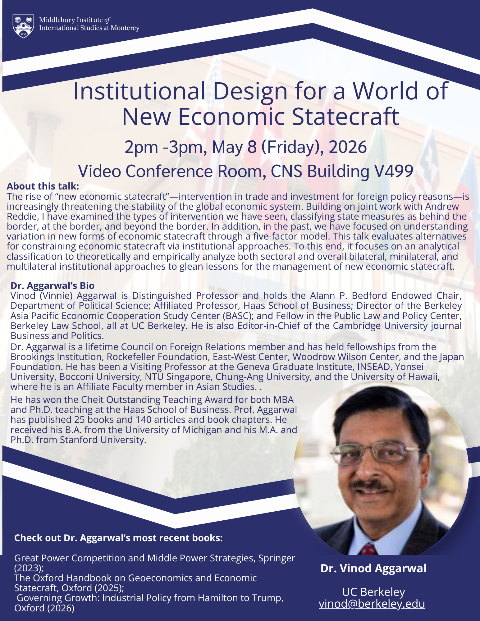 Vinod (Vinnie) Aggarwal is Distinguished Professor and holds the Alann P. Bedford Endowed Chair, Department of Political Science; Affiliated Professor, Haas School of Business; Director of the Berkeley Asia Pacific Economic Cooperation Study Center (BASC); and Fellow in the Public Law and Policy Center, Berkeley Law School, all at UC Berkeley. He is also Editor-in-Chief of the Cambridge University journal Business and Politics