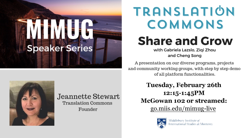 Jeannette Stewart, Founder, Gabriela Lazslo, Advisor and G-suite Admin, Ziqi Zhou, Community Manager, and Cheng Song, Community Manager, will present Translation Commons, an online community offering an independent platform for sharing linguistic knowledge freely, so that, together, we create a world without communication barriers where no language and no linguist is left behind. Its mission is to share knowledge, offer free tools, organize language resources and facilitate community initiatives.