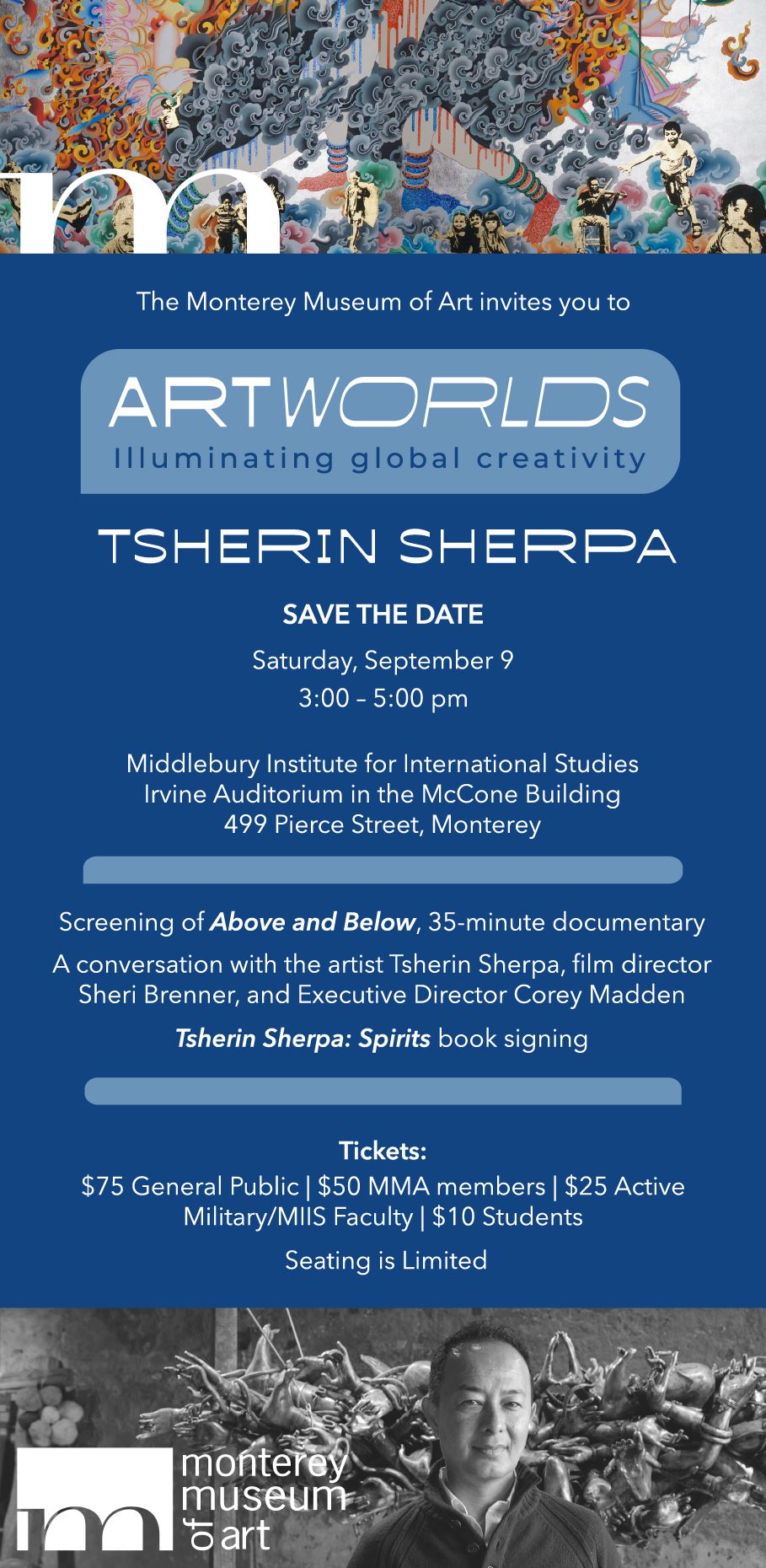 Tsherin Sherpa was named 2023 Global Asia Arts Game Changer by the Asia Society for his cultural development work in Katmandu—as well as his extraordinary art work. Sherpa organized the first Tibet pavilion at the Venice Biennale in 2022, was featured in the groundbreaking Awaken exhibit at the Rubin Museum in NYC in 2020. In 2022 a solo exhibit Spirits wasorganized by the Virginia Museum of Fine Arts, and subsequently presented byb the Peabody Essex Museum and Asia Society-Houston.