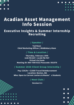 Feb 19 Acadian Asset Management Info Session: Executive Insights & Summer Internship Recruiting 12:00 PM PT Closed to the Public