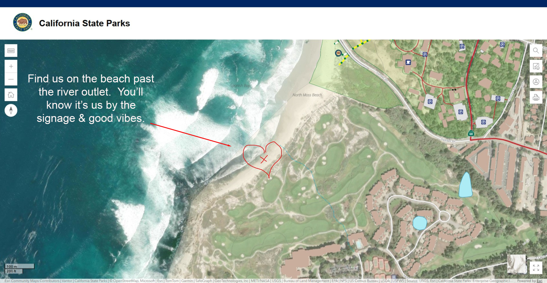 Exactly Where: You’ll find us on the beach past the river outlet (on the Pebble Beach side where fires are permitted), and you’ll know it’s us by the signage and the good vibes. Here is a little visual for where to look for us.