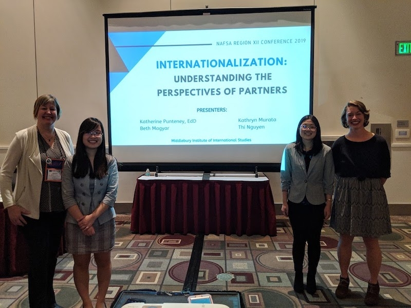 Middlebury Institute students Beth Magyar MAIEM ’20, Kathryn Murata MAIEM ’20, and Thi Nguyen MAIEM ’20 joined International Education Management professor Katherine Punteney to lead a workshop at the NAFSA Region 12 Conference in Pasadena, CA in November 2019.
