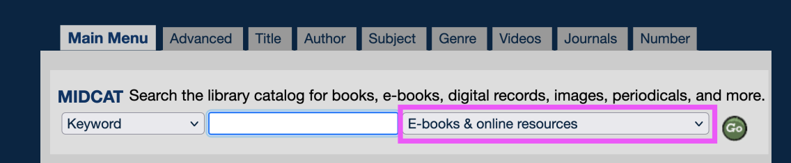 Search for e-books using MIDCAT (go/midcat/). In the drop-down menu to the right of the search, you can filter to our ‘E-books & online resources’ collection.
