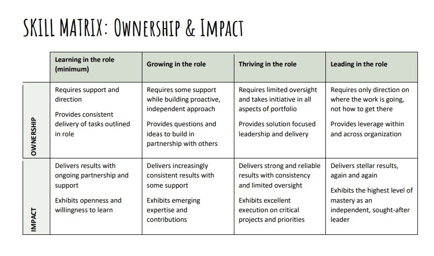 The skill matrix is a valuable tool to support ongoing collaboration between managers and their staff as it helps us to interpret how the impact and ownership each of brings to our work translates into success for the department and institution. For guidance and support in making the most of the skill matrix, please connect with your HR Business Partner.