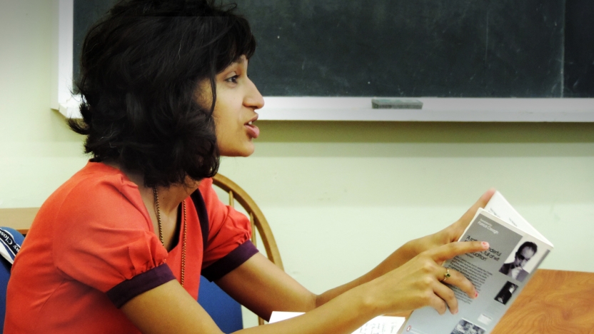 11 a.m. - 12:15 p.m. Himali makes a point during discussion in her Calvino, Borges, Beckett class, which meets daily during this time.