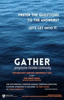 Gather is a community for the progressive Christian, Christian-curious, Christian-conflicted, agnostic, and generally bewildered. Join Affiliate Christian Chaplain Katie Runde Sanchez for conversations; the topic on Oct. 19 is Jesus and Non-Violence.
