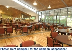 The new dining hall has high ceilings and one of its walls, consisting