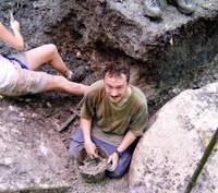Augmenting their experience at Jaguar Hill, which was funded by a Middlebury College undergraduate collaborative research grant, Grimmnitz and Montagne learned about Maya royal architecture firsthand with pyramids and a royal palace on Fitzsimmons’ guided tour of famous Maya sites. They were instructed in the aftereffects of looting and explored looters’ tunnels to the entrance of a royal tomb. Descending into the tomb, which was a small room the size of a typical college dormitory, they discussed the negative impact that looting has had on the Maya area, and identified types of information still obtainable from looted historical sites.