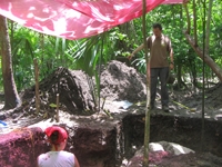 Fitzsimmons suspected more stelae were buried in the courtyard of the palace ruins, and he formed a small excavation team - with Grimmnitz, Montagne and two additional students from the University of Vermont - to find them. In the next few weeks, they uncovered three additional stone monuments, two of which bore portraits and hieroglyphs. The third was a rounded altar approximately two meters in diameter, which Fitzsimmons believes was a companion piece to one of the monoliths. In addition to authenticating events in the life of the new Maya king, the inscriptions confirmed the identification of the city by the ancient Maya name of Hix Witz, which means jaguar hill. The newly discovered stelae appear to describe the king’s performance of ritual bloodletting and the deposition