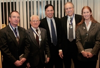 The 2007 Citizens’ medalists, shown here with Middlebury College President Ronald D. Liebowitz, are (from left) Fletcher Brush, Lucien Paquette, Liebowitz, Dr. Michael Steier and Christine Steier.Photograph by Trent Campbell.
