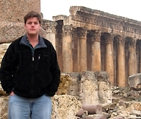 Theodore May explores the ruins of the Temple of Dionysus during his travels to the Bekka Valley, Lebanon