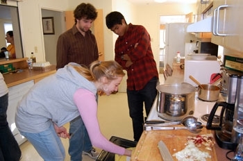Making lasagna to feed dozens of migrant farm workers and their families is a multi-step process, as Middlebury students can attest. Helping out in the Carr Hall kitchen are Kaylen Baker ‘12 (reaching into the oven), Scott Gratton ‘09, left, and Alan Lim ‘09.