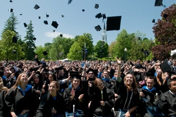 About the time that Hirshberg, the president and CEO of Stonyfield Farm, maker of organic yogurt and other dairy products, wrapped up his speech, the rain stopped, and before too long, the clouds blew away. Most of the degrees were awarded under sunny, bright blue skies. The blue ponchos and multicolored umbrellas that had bloomed like so many spring flowers were put away, and the sunblock came out.
