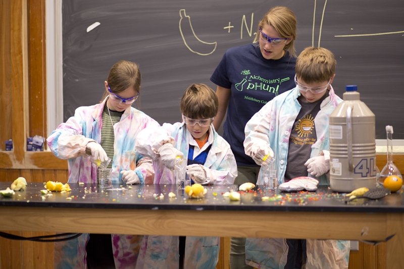 The five Middlebury chemistry students could have been magicians for the wonder they stirred (and mixed and detonated) before a crowd of Addison County kids on Wednesday night at McCardell Bicentennial Hall. In an evening titled “Alchemistry pHun! An Exciting Demonstration of Chemical Experiments,” the students delivered a steady stream of colors, sounds, smells and laughs to the eager audience.