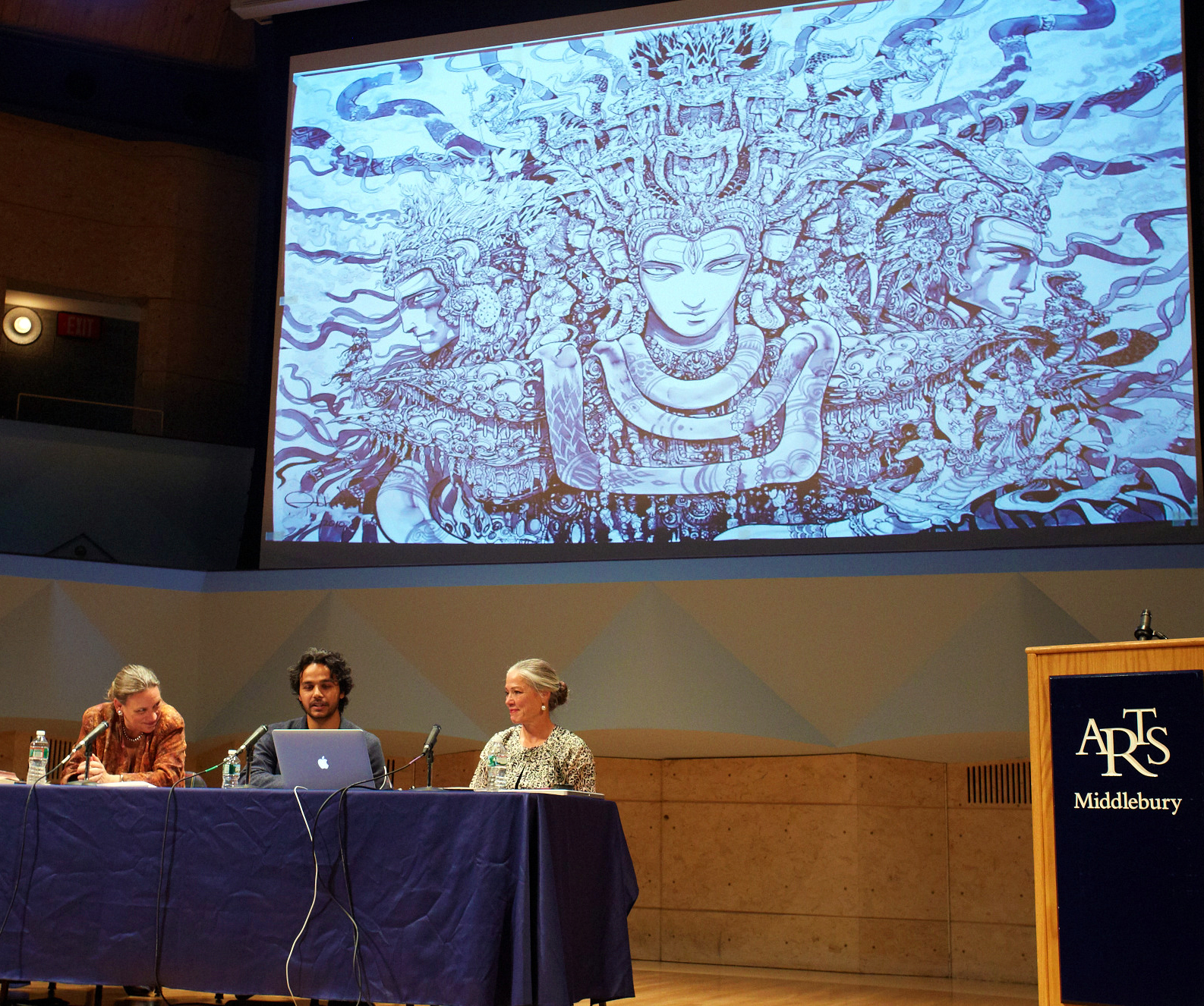 MIDDLEBURY, Vermont — To a backdrop of exquisitely colorful illustrations, President Laurie Patton and illustrator and fine artist Abhishek Singh helped bring meaning to the Mahabharata, the epic 100,000-verse poem that is one of India’s most ancient texts. The talk, presented in conjunction with the exhibition, “The Art of Storytelling: Five Tales from Asia, Then and Now,” drew a crowd of about 150 faculty, staff and students to Robison Hall.