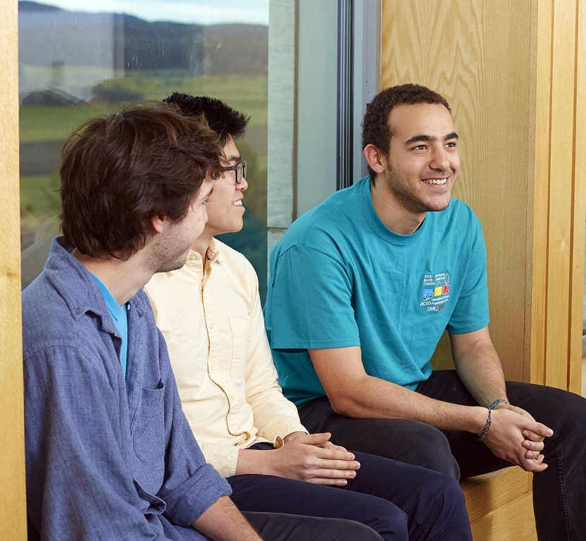 Tom Dobrow, Davin Chia, and Sherif Nada in the student lounge of the Computer Science Department in Bicentennial Hall. At the International Collegiate Programming Contest, the three-member teams share one computer to solve problem sets.