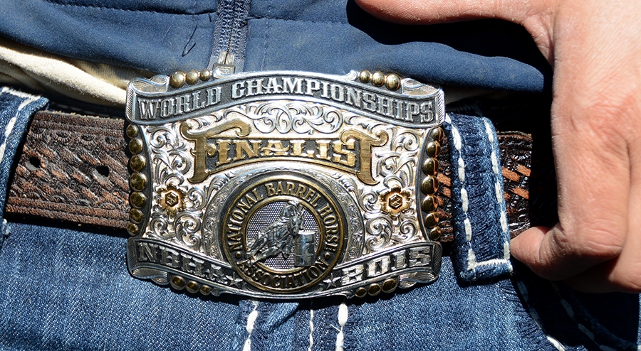 Christine Seymour and her 22-year-old sorrel mare named Continental Bell (top) practice in Brandon (middle) for the nationals where it’s all about winning another championship belt buckle. (Click on images to enlarge)