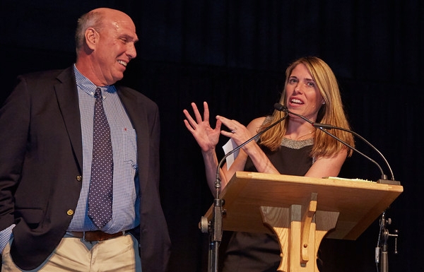 Sheehan, who passed away in 1999, was introduced by one of his admiring skiers, John Morton ’68, who said “Bobo had an easygoing sense of humor [and] rarely got rattled.” He would tell us “to kick down hard, boys, and make it work,” Morton recalled, and while “his coaching style seemed hopelessly haphazard at times,” Sheehan “showed us that skiing should always be fun.” The pewter plate for Bobo Sheehan was accepted by his daughter, the legendary professional golfer Patty Sheehan, and son, Jack Sheehan. Both children spoke about the lives their father touched with humor and grace, and how loving, kind, and thoughtful he was.