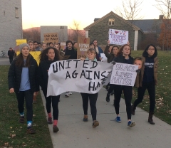 An estimated 150-200 undergraduates marched through campus chanting “Not my president” while carrying signs and banners.